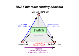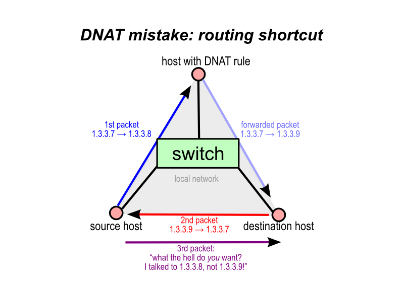 Reference: http://www.faqs.org/docs/iptables/traversingoftables.html The whole situation can be understood by this sample image.The image explains what is the need for modification of source IP address before releasing the packet .If source address modification is not done then the source host(the one which http://27.248.190.177:8080 accessed this in his browser ) which actually requested to your PC (host with DNAT rule) will finally get reply from google.com(destination host) (see the diagram) and the obvious reaction to this by the source host will be "Who the hell are you.I did not requested you ;) " or may be "What the hell do you want ? ;)".